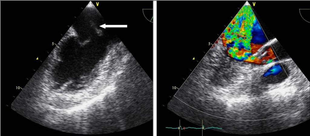 Чреспищеводная ЭхоКГ: стрелкой показано пролабирование передней створки митрального клапана с папиллярной мышцей в полость левого предсердия