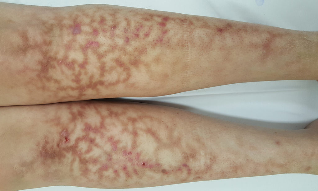 Телеангиэктазии – поражение самых мелких подкожных вен, которые расположены в дерме и лежат сразу же под наружным слоем кожи (эпидермисом). Выглядят они, как розовые или фиолетовые сосуды на ногах, могут иметь ярко-красный, интенсивно-синий оттенок, похожи на тонкую паутинообразную сеточку.