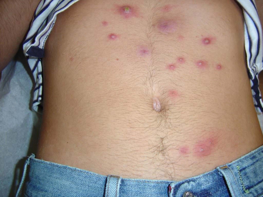 Проявления тромбоцитопенической пурпуры в виде пятнистых разноцветных высыпаний