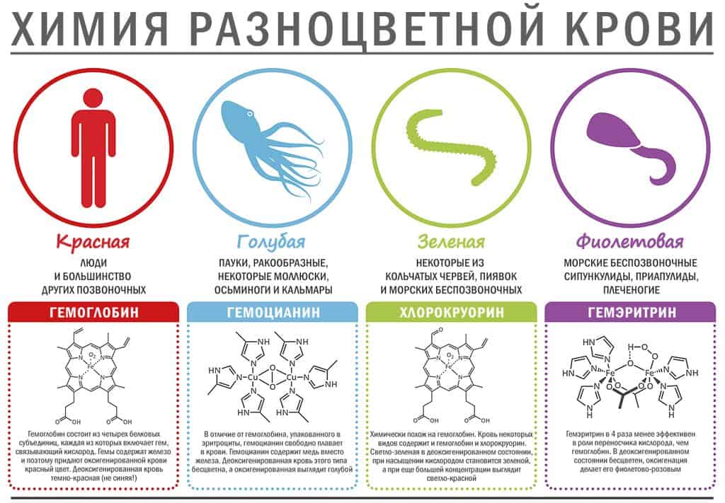 Точно установлено, что в естественной среде синяя кровь определенно бывает, например, у спрутов, улиток, осьминогов, пауков, скорпионов, моллюсков и насекомых. Причиной этой природной красоты выступает уже упомянутый гемоцианин, который существует не только в фантастических мирах, но и в реальной жизни. Необычное вещество, окрашивающее соединительную ткань некоторых живых организмов в непривычный цвет, было впервые изучено в 1878 году ученым из Бельгии Леоном Фредерико. Именно он верно предположил, что данный дыхательный пигмент является практически абсолютным функциональным и структурным аналогом гемоглобина с той лишь разницей, что гемоцианин содержит в себе медь, а гемоглобин – ионы двухвалентного железа. Именно последнее железосодержащее вещество придает человеческой крови красный оттенок и, как было выявлено, лучше всего справляется с задачей снабжения тела кислородом.