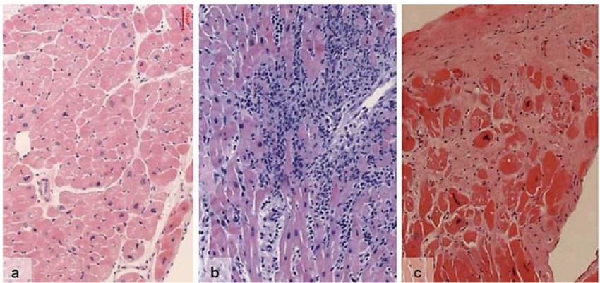 а) здоровый миокард; b) острый миокардит с участками очагового отека и некроза; c) хронический миокардит с гипертрофией кардиомиоцитов, интерстициальным фиброзом и рубцеванием.