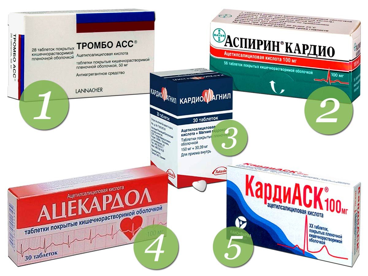 Препараты антиагреганты производятся на основе ацетилсалициловой кислоты. К их числу относятся Аспирин, Аспекард, Аспирин-кардио. Широко применяются Тромбо АСС, Кардиомагнил, Магникор