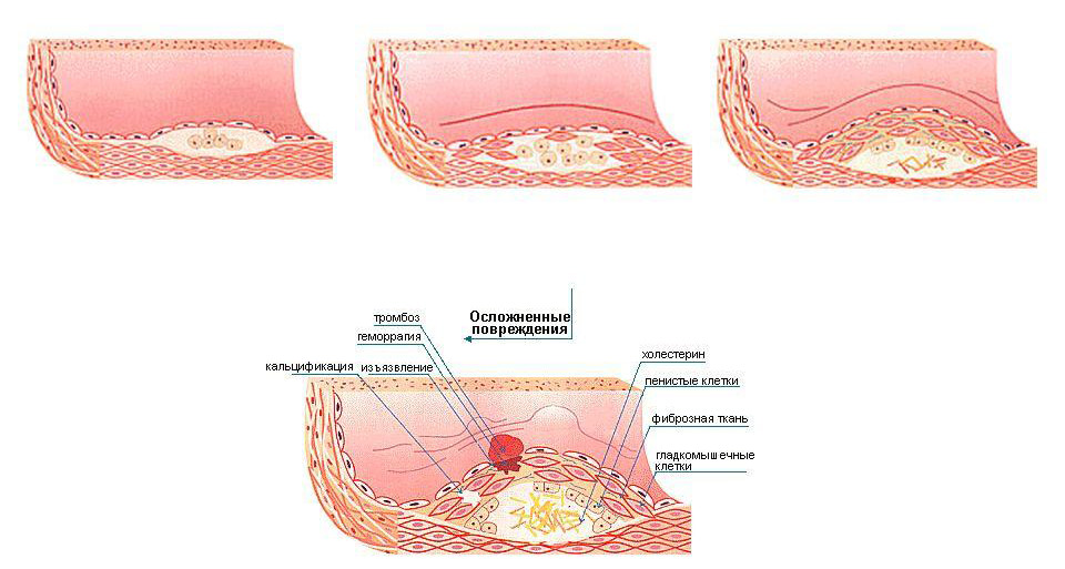 Первая стадия заключается в появлении жировых полосок на внутренней стенке эластичных кровеносных сосудов и является незаметной для человека. На второй стадии в области жировых пятен (полосок) образовывается соединительная ткань, которая при дальнейшем разрастании формирует бляшку.