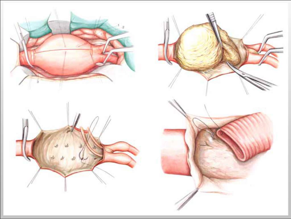 Радикальной операцией является проведение лапаротомии. Находится расширение брюшной части аорты и проводится ее резекция (иссечение аневризмы вместе с частью аорты). Если во время операции установлено, что в процесс вовлечены подвздошные артерии, то проводится их протезирование.