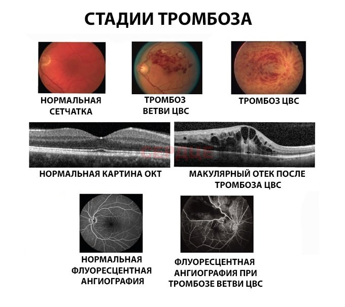 При длительном застое в вене крови повышается проницаемость сосудов, жидкая составляющая крови выходит в пространство между сосудами, развивается отек сетчатки с формированием кровоизлияний. Внешне пораженная вена извита и расширена, вдоль нее видны кровоизлияния, сетчатка этой области становится бледной и отечной.