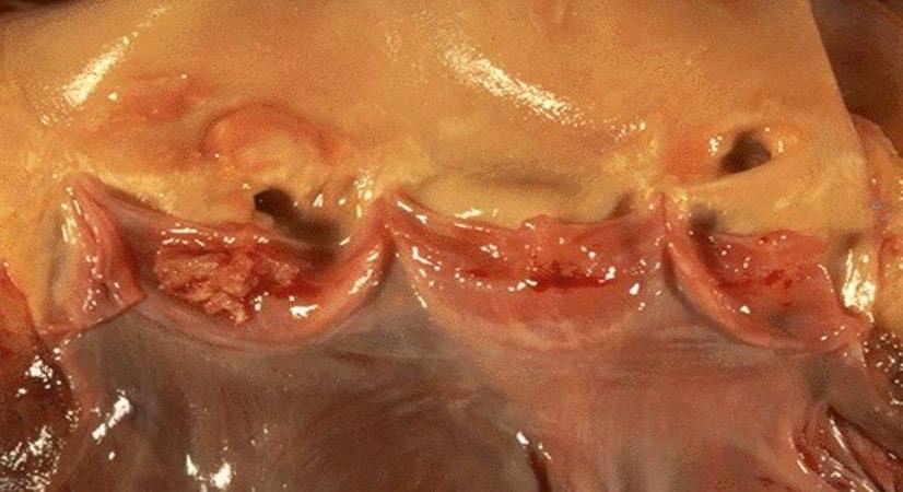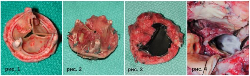 На рис.1 : протезированный клапан заражен возбудителем Enterococcus; рис. 2-4: исскуственные клапаны, инфицированные Staphylococcus aureus, на рис. 4 обширное разрушение тканей сердца с абсцессом корня аорты.