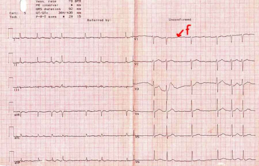 - Регистрирация так называемых волн фибрилляции с интенсивностью 300-400 в минуту, нерегулярных, разнящихся по продолжительности и амплитуде;