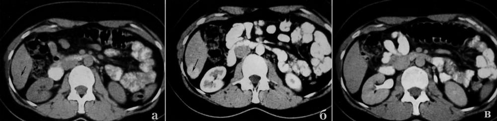 Узловая гиперплазия печени При нативном КТ исследовании (а) в 6 сегменте неотчетливо определяется образование, изоинтенсивное с паренхимой печени (стрелка). В артериальную фазу (б) контрастного усиления образование интенсивно и равномерно набирает контрастное вещество. В центе образования намечается формирование центрального рубца (стрелка). В венозную фазу (в) наблюдается вымывание контрастного вещества до состояния изоинтенсивности.