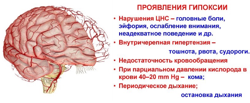 - пребывание на большой высоте (горы, полет в самолете) и вдыхание воздуха с низким парциальным давлением кислорода;