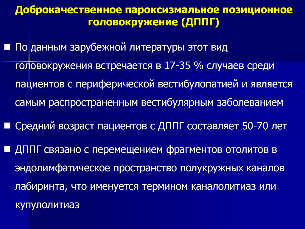 Симптомы доброкачественного позиционного пароксизмального головокружения – это появление кратковременных (по несколько секунд) приступов головокружения, которое наблюдается только при смене положения тела (с вертикального на горизонтальное и, наоборот, при переворачивании тела во время сна, запрокидывании головы). Но чаще всего головокружение появляется ночью во время сна, что нарушает полноценный отдых. Приступный период может смениться длительным периодом ремиссии. На самом деле природа заболевания изучена не достаточно (впервые описана в начале двадцатого века), но характерные симптомы дают возможность врачу заподозрить ДППГ.