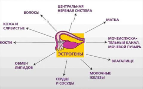 Эстрогены у женщин влияют на характер женщины (мягкость, эмоциональность, уступчивость), от него зависит скорость обновления клеток, он влияет на сохранение молодости и здоровья кожи (кожа становится более тонкой и гладкой), волос; эстроген у женщин уберегает сосуды от холестериновых бляшек, тромбов, не дает развиваться ССЗ.