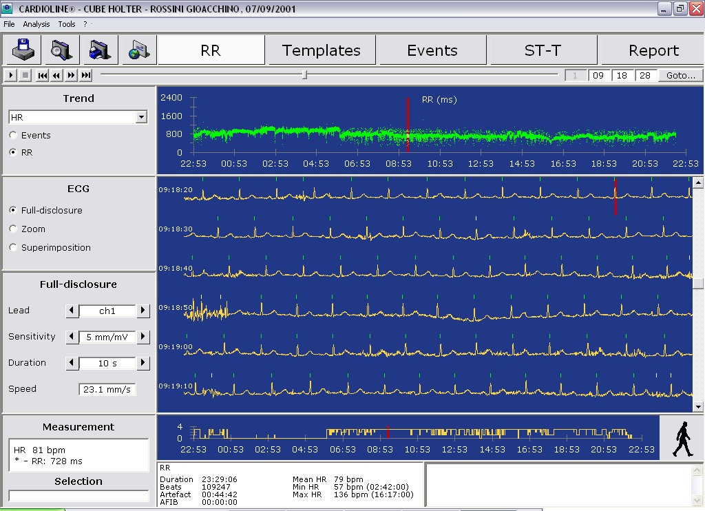 Таким образом, после окончания исследования запись холтера просматривается, корректируется и обрабатывается на компьютере врачом – в этом заключается расшифровка холтеровского мониторирования. Хотя общепринятый протокол на этот счет отсутствует, некоторые параметры должны быть оценены в обязательном порядке (ритм, источник, ЧСС, экстрасистолы, приступы аритмий, паузы ритма, интервалы PQ и QT, комплекс QPS, сегмент ST, кардиостимулятор, если он установлен, записи пациента в дневнике и др.).