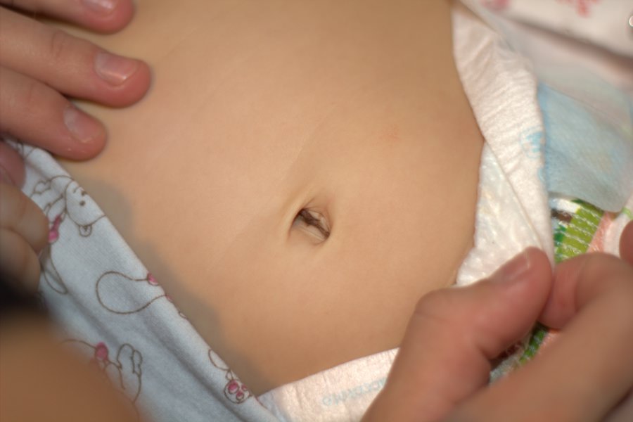 - Есть подозрения на грыжу. При любой интенсивности крика или кашля младенца вы можете заметить, что его пупок увеличивается и может достигнуть размера грецкого ореха. Необходима консультация хирурга, который подтвердит или опровергнет необходимость операционного вмешательства. Выкладывание на животик и специальный массаж рекомендован младенцам только после 3-х месяцев. Операция по вырезанию грыжи проводится только по достижению ими 3-х лет.