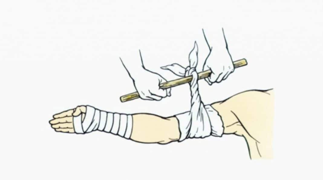 Если под рукой нет жгута – воспользуйтесь отрезом ткани и палкой
