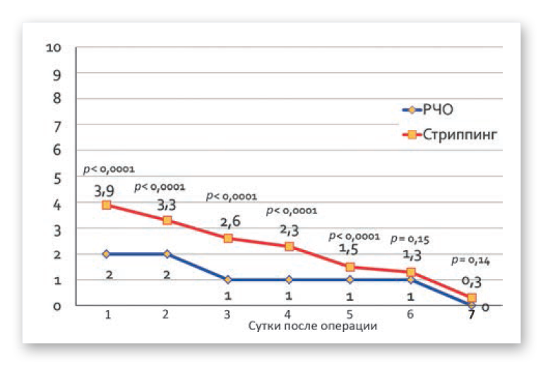 Медиана уровня боли в бедре в 1-е сутки после РЧО оказалась равной 1,5, после стриппинга — 4,0,