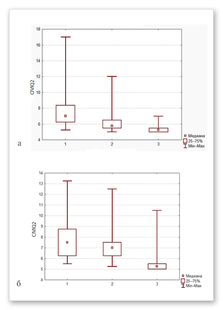 по опроснику CIVIQ2 после РЧО (а) и стриппинга (б) до