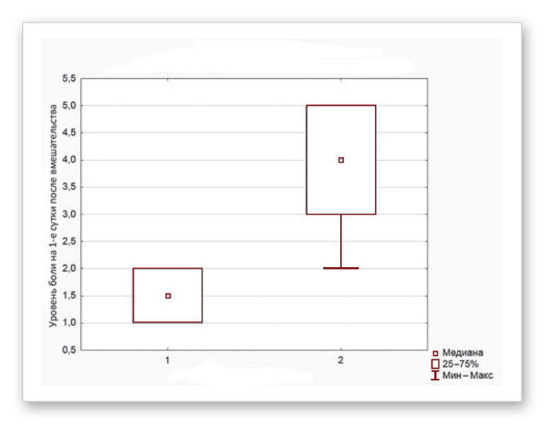 различия статистически значимы (p=0,0002). Диаграмма размаха значений уровня боли представлена на рис. 1.