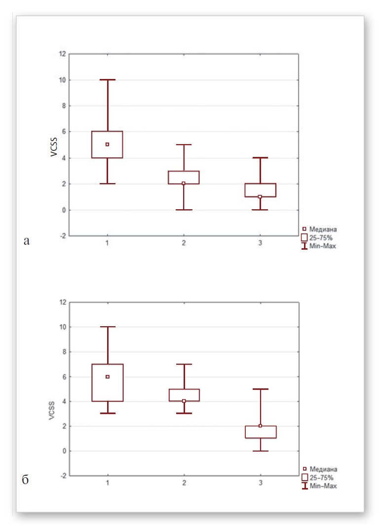 вания по шкале VCSS после РЧО (а) и стриппинга (б) до