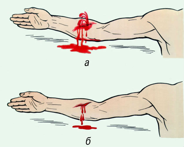 Клинические проявленияИнтенсивность кровотечения и внешний вид крови зависят от типа (артерия, вена или капилляр) и калибра (мелкий или крупный) поврежденного сосуда. При массивном кровотечении возможны попадание крови в дыхательные пути с остановкой дыхания, а также развитие шокового состояния в результате кровопотери.