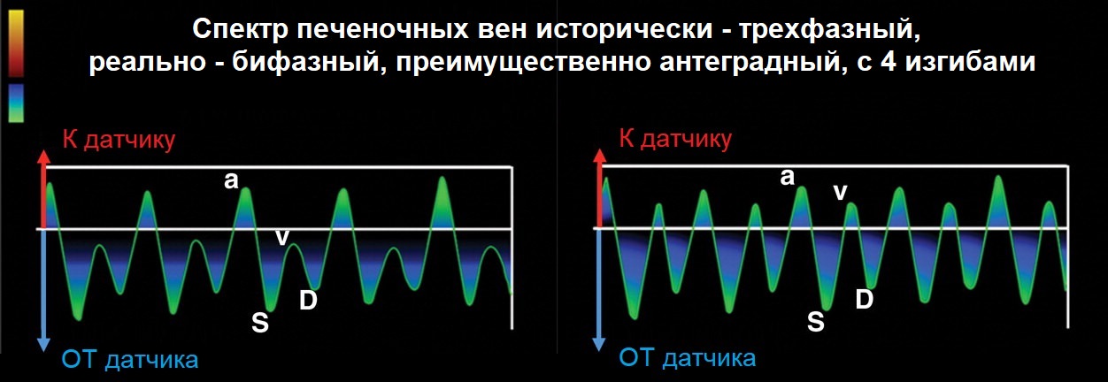 Рисунок. Спектр печеночных вен исторически — трехфазный, а реально — бифазный, преимущественно антеградный, с 4 изгибами (подробнее смотри Доплер сосудов начинающим): сокращение предсердий в конце диастолы — а-пик, систола — S-волна, раскрытие трикуспидального клапана в конце систолы — v-пик, диастола — D-волна. В печеночных венах основную часть времени кровоток ОТ датчика — при ЦДК синий цвет и спектр ниже базовой линии. Когда давление в правом предсердии нарастает — предсердный толчок и раскрытие трикуспидального клапана — спектр поднимается.