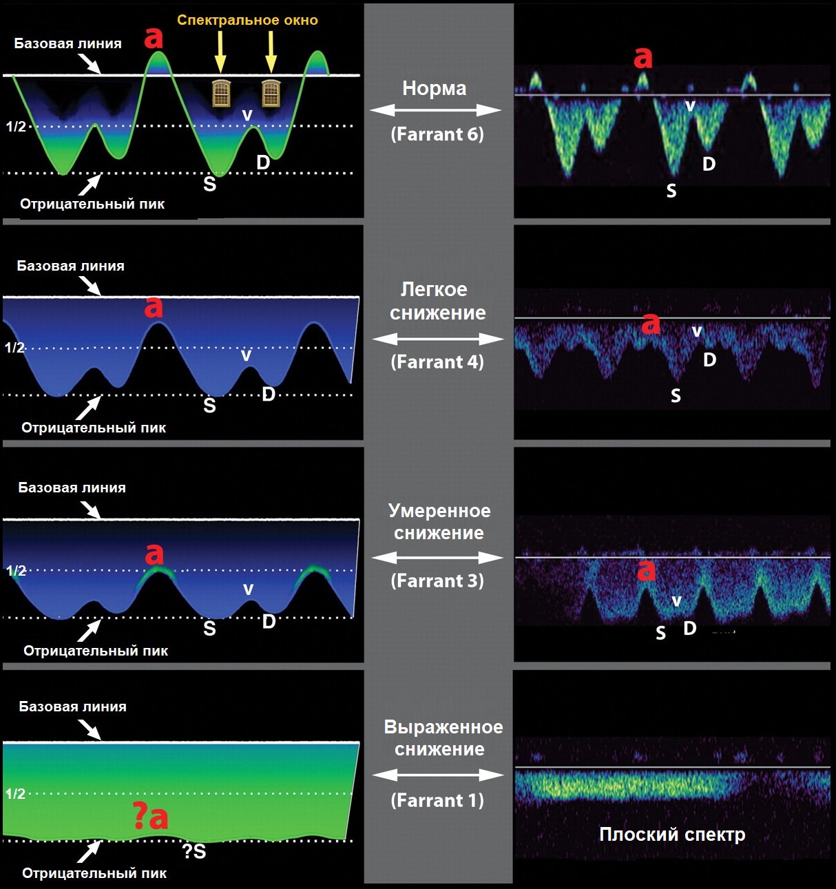 Рисунок. Шкала Фаранта для оценки пульсации в печеночных венах. Определяющим является положение a-пика и S-волны. В норме а-пик выше базовой линии. Если а-пик опускается чуть ниже базовой линии — это легкое снижение пульсации, встречается у 10% здоровых людей. Если a-пик опускается на половину глубины S-волны — это умеренное сниженной пульсации, всегда ненормально. Когда изменения выраженные, спектр становится плоским.