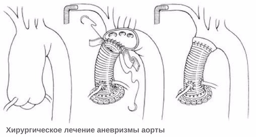 Хирургическое лечение заключается в иссечении «разболтанного» участка стенки аорты, который образовал аневризму, и ушивании образовавшегося отверстия. При больших дефектах после резекции крупной аневризмы нужно провести протезирование аорты – иначе ушивание отверстия может привести к натягиванию тканей и несостоятельности швов (прорезыванию ниток) или, в лучшем случае, сужению прооперированного участка аорты, что негативно повлияет на ток крови в этом месте.