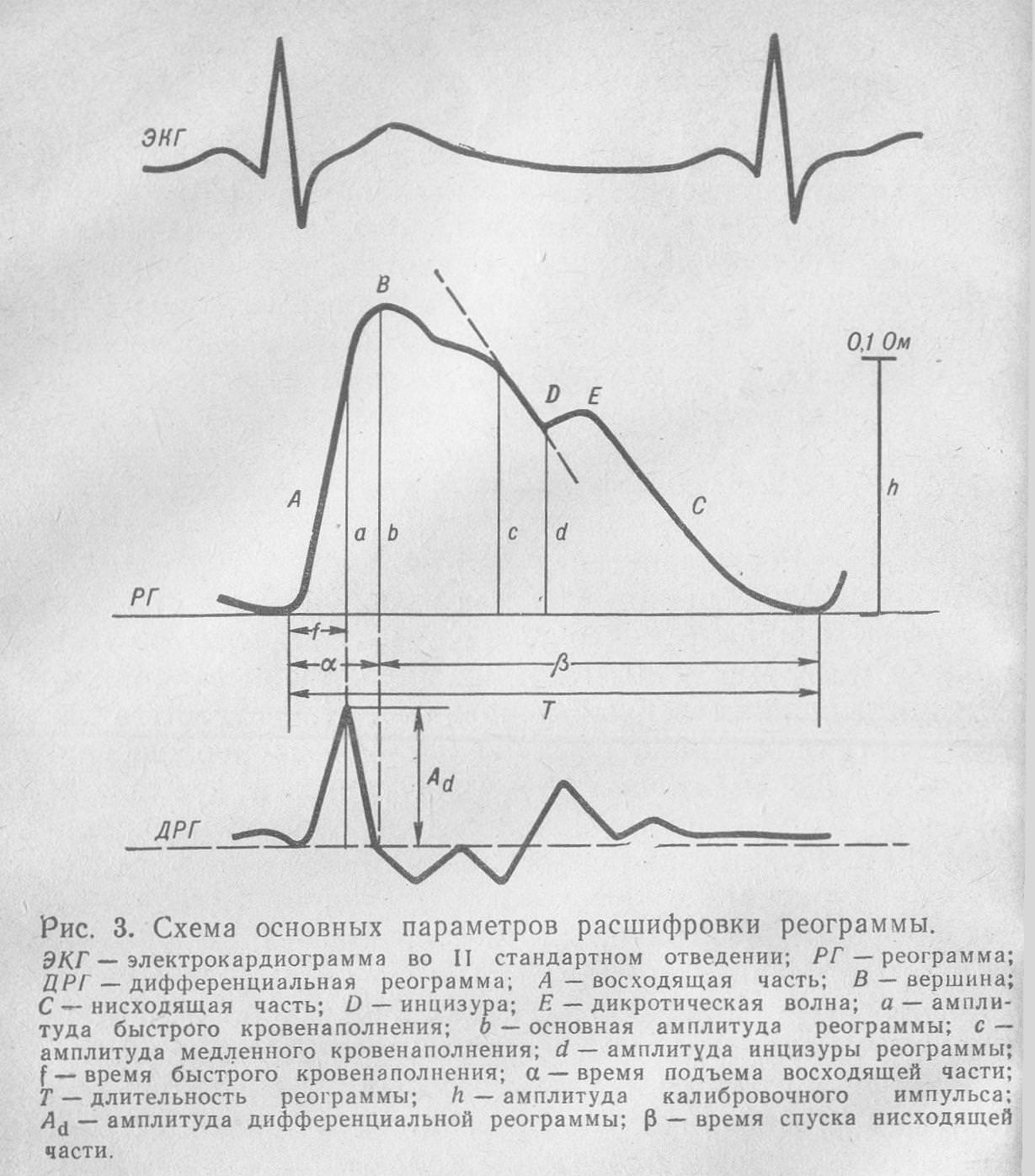 В период поступления крови в исследуемую зону меняется величина электропроводности, это изменение фиксируется и выдается в виде графиков отдельно для правой и левой стороны. Для того чтобы иметь представление, когда сердце сокращается и выбрасывает кровь в артериальную сеть, одновременно с РЭН снимают и ЭКГ во втором отведении.