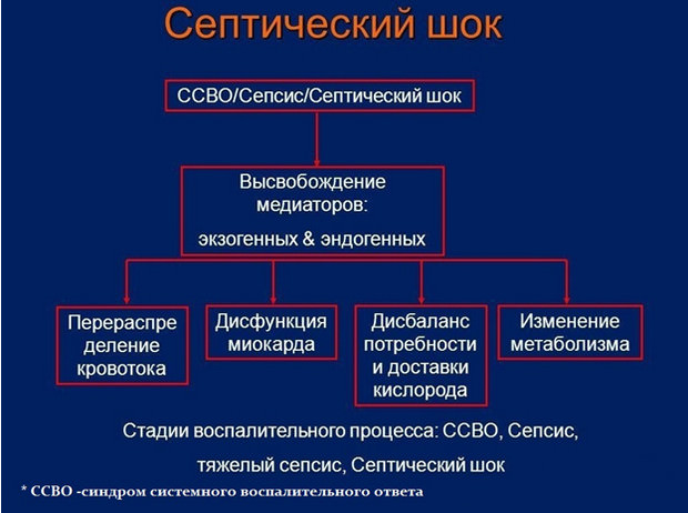 В дальнейшем, при прогрессировании симптомов септического шока, развивается терминальная стадия сепсиса, характеризующаяся тяжелой сердечно-сосудистой, дыхательной, почечной, надпочечниковой недостаточностью, уремией, диссеминированным внутрисосудистым свертыванием крови, отеком легких и мозга, гемолизом эритроцитов и т.д.