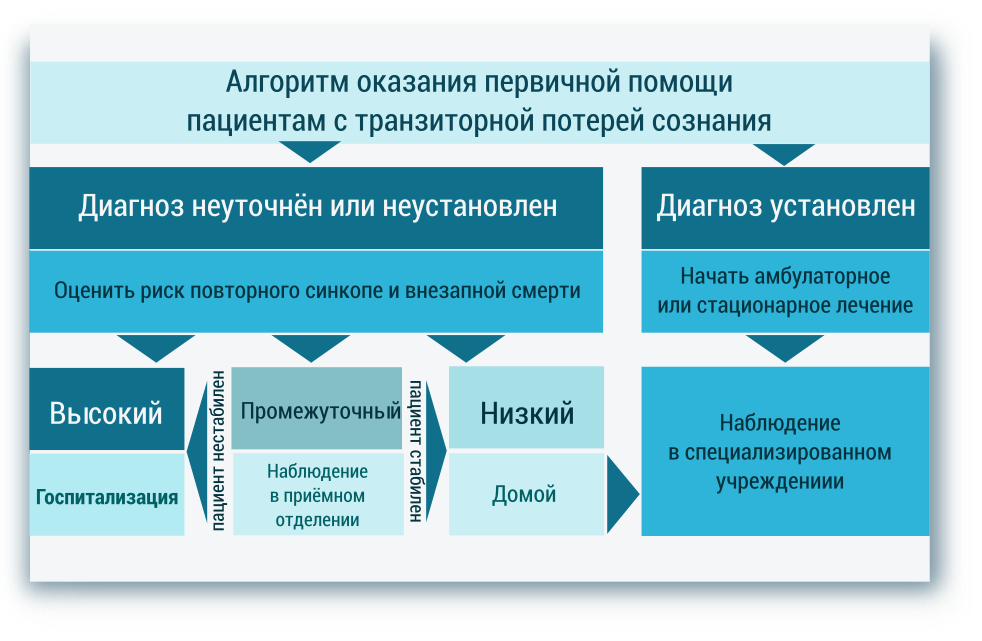 - При высоком риске повторных синкопе, признаках связи приступов с серьёзными состояниями, необходимы неотложная оценка и лечение.