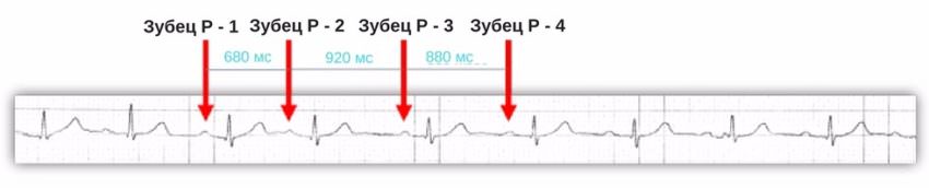Ниже представлена картинка, как выглядит синусовая аритмия на ЭКГ, где можно увидеть временную разницу между интервалами P-P. Например, между первым и вторым зубцами временной интервал короче, чем между вторым и третьим.