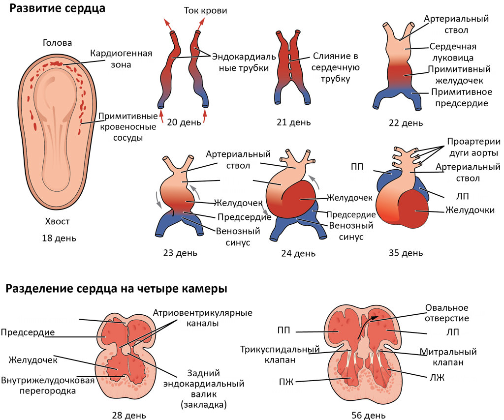 Сердце человека начинает формироваться на третьей неделе внутриутробного периода и продолжается весь период вынашивания беременности, проходя стадии от однокамерной полости к четырехкамерному сердцу.
