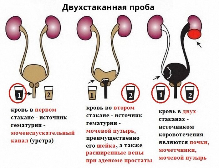 Трехстаканная проба позволяет выявить источник воспаления при гематурии. При анализе она подразделяется на следующие стадии: