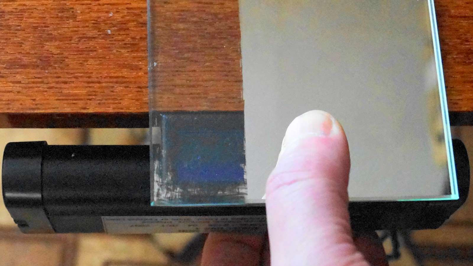 Брусок убирается. Соединенные стекла укладываются на стол. Залитая жидкость должна равномерно распределиться по межстекольному пространству, вытесняя пузырьки воздуха через имеющиеся зазоры в углах. После чего их заделываем с помощью пластилина.