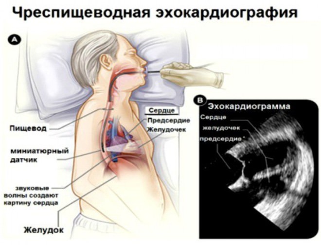 В ситуациях, когда трансторакальная форма диагностики по некоторым причинам недоступна, выполняют чреспищеводное, или трансэзофагеальное, Эхо. Такими причинами могут быть утолщенный слой подкожного жира, анатомические преграды (мышцы, суставы, кости и так далее), протезированный клапан, провоцирующий акустические помехи. Датчик при этом крепится на конце глотательной трубы, которая вводится в пищевод. Принимающее устройство располагается в непосредственной близости к левому предсердию, позволяя осуществить детальный осмотр мельчайших структур сердца. Продолжительность инвазивного нахождения зонда – около 12 минут. Противопоказаниями к чреспищеводному УЗИ являются кровотечения, варикозное расширение венозных сосудов пищевода, воспалительные заболевания легких и другие.