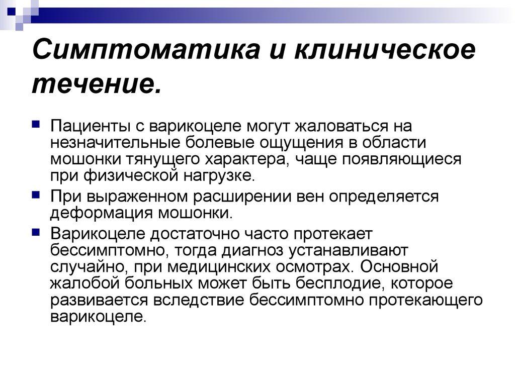 На 1 стадии болезни единственным клиническим проявлением могут быть изменения в спермограмме, а нарушение работы вен обнаруживается только при углубленном исследовании по поводу бесплодия.